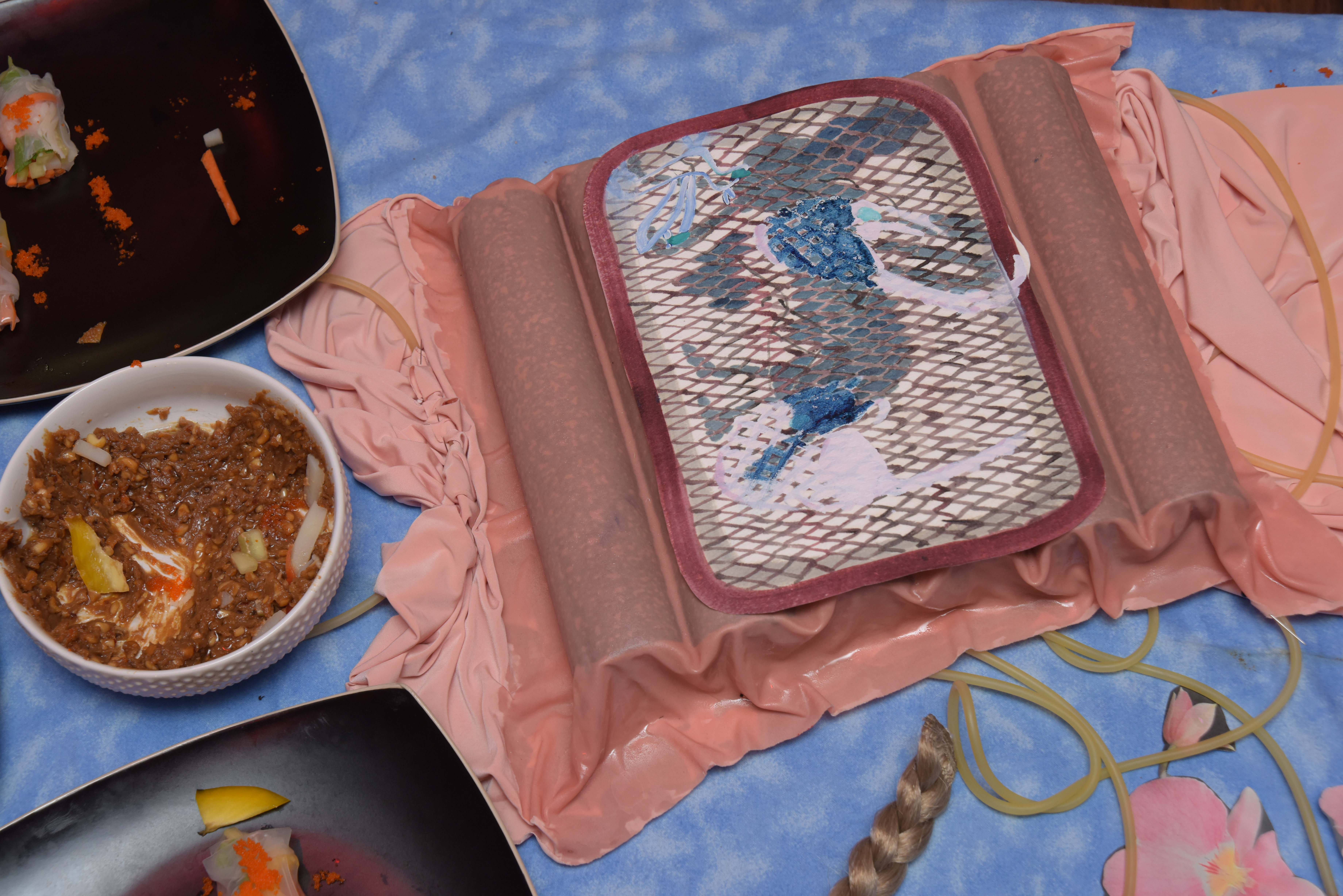 Insulation pipe, found fabric, pins, printed organza, discarded plastic material, acrylic paint, yarn, curtain tie backs.